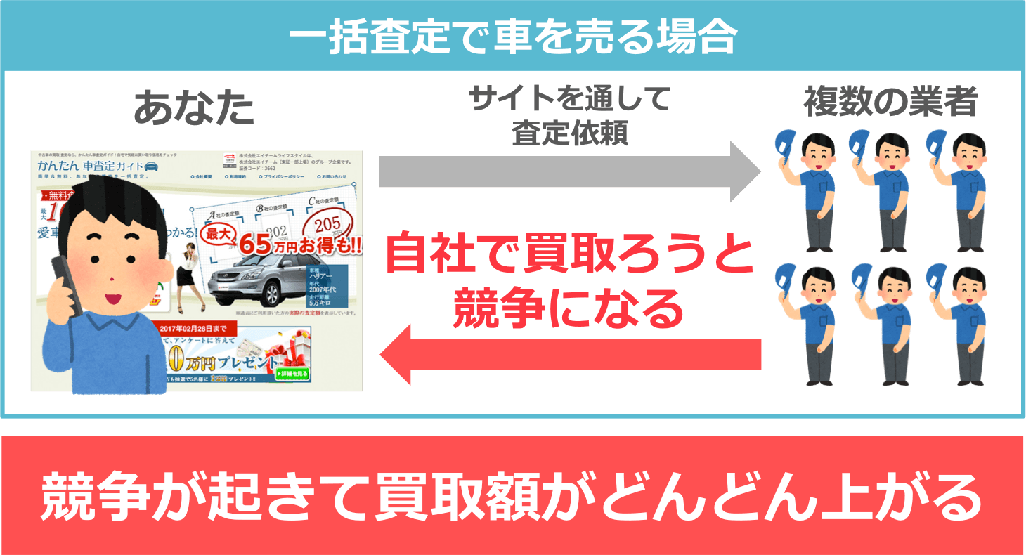このように、一度査定に出せば価格競争が起きて買取額が上がりやすいというのが一括査定の一番のメリット。