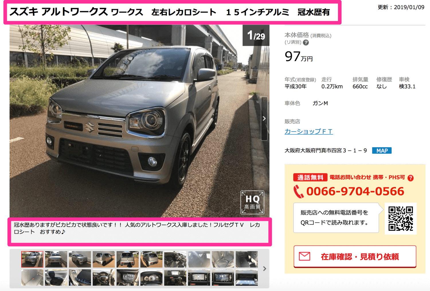 大々的に『冠水歴有』と書いていますし、説明欄にも冠水歴があることを記載していますね。