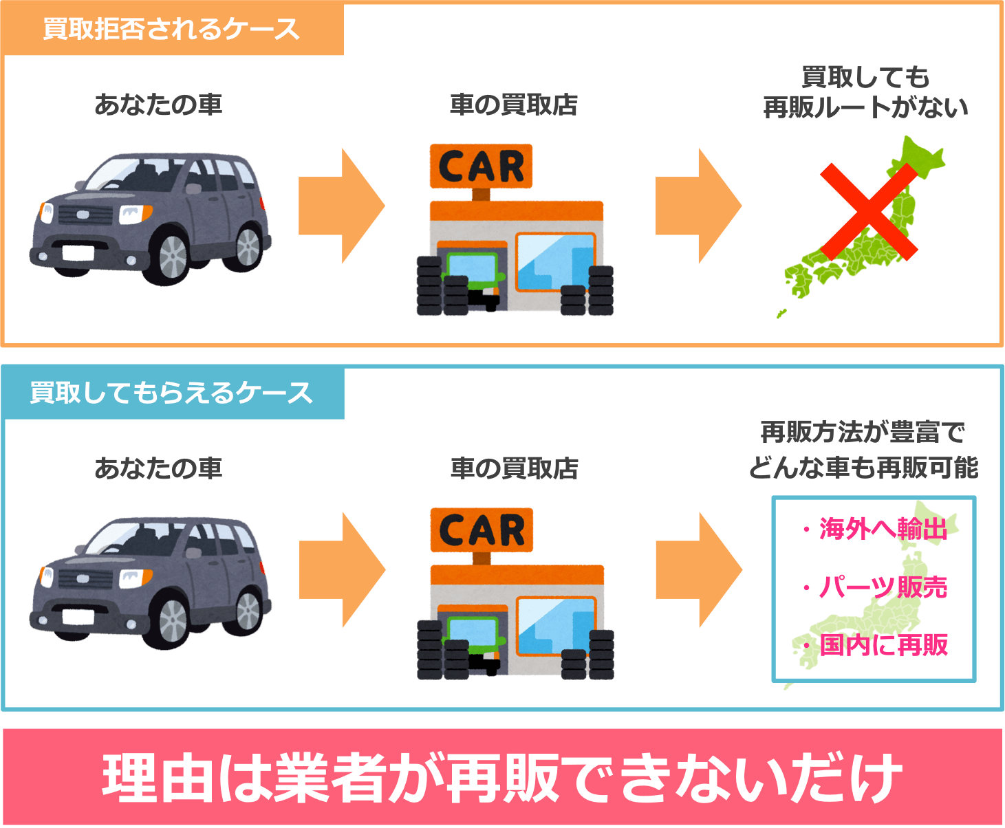 買取拒否される理由は、単純に業者が再販ルートがなくて利益にすることができないだけなので、あなたの車が本質的な原因ではないのです。