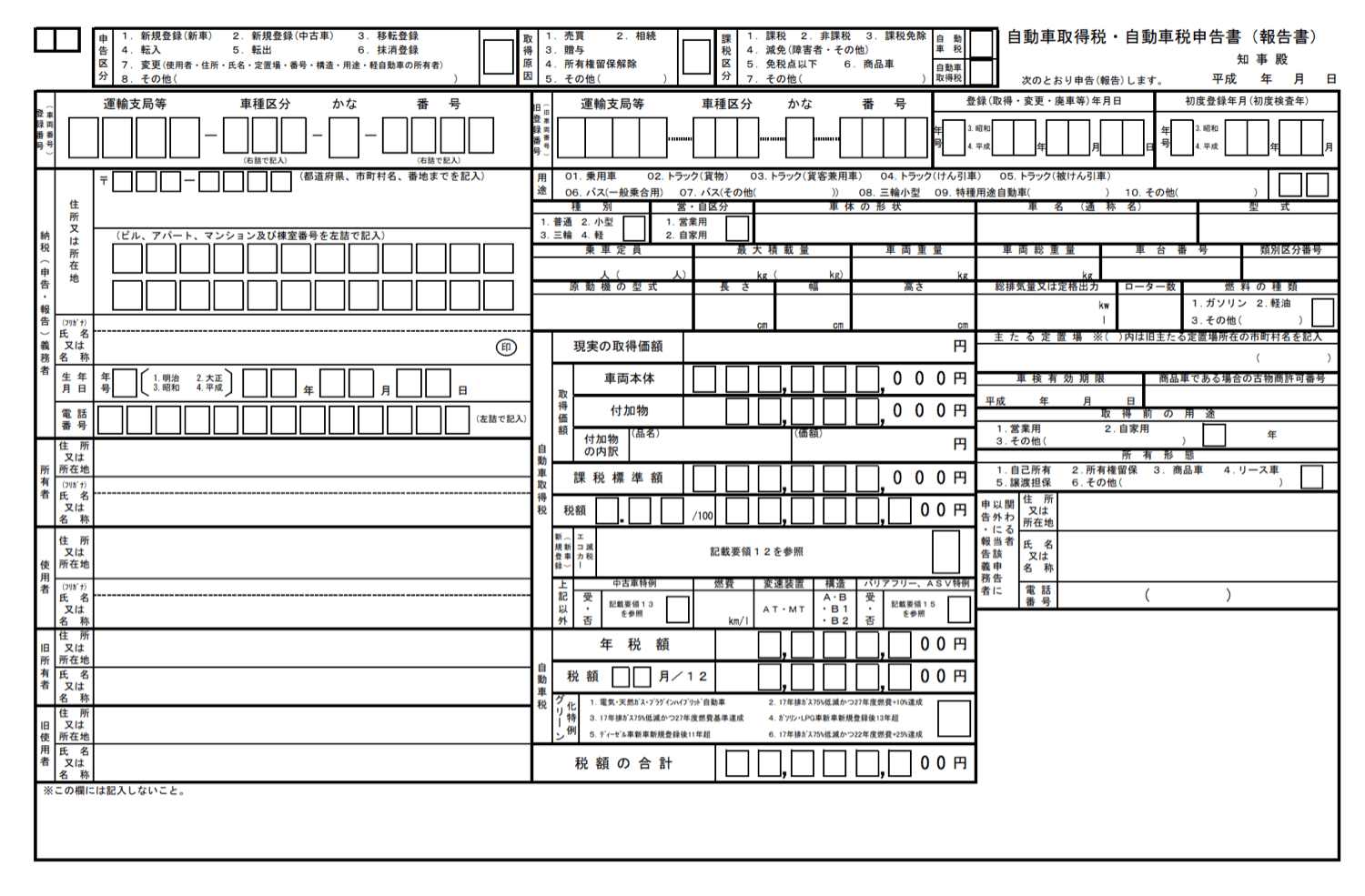 | 自動車税・自動車取得税申告書 | 陸運局の横にある税事務所 | 不要 |