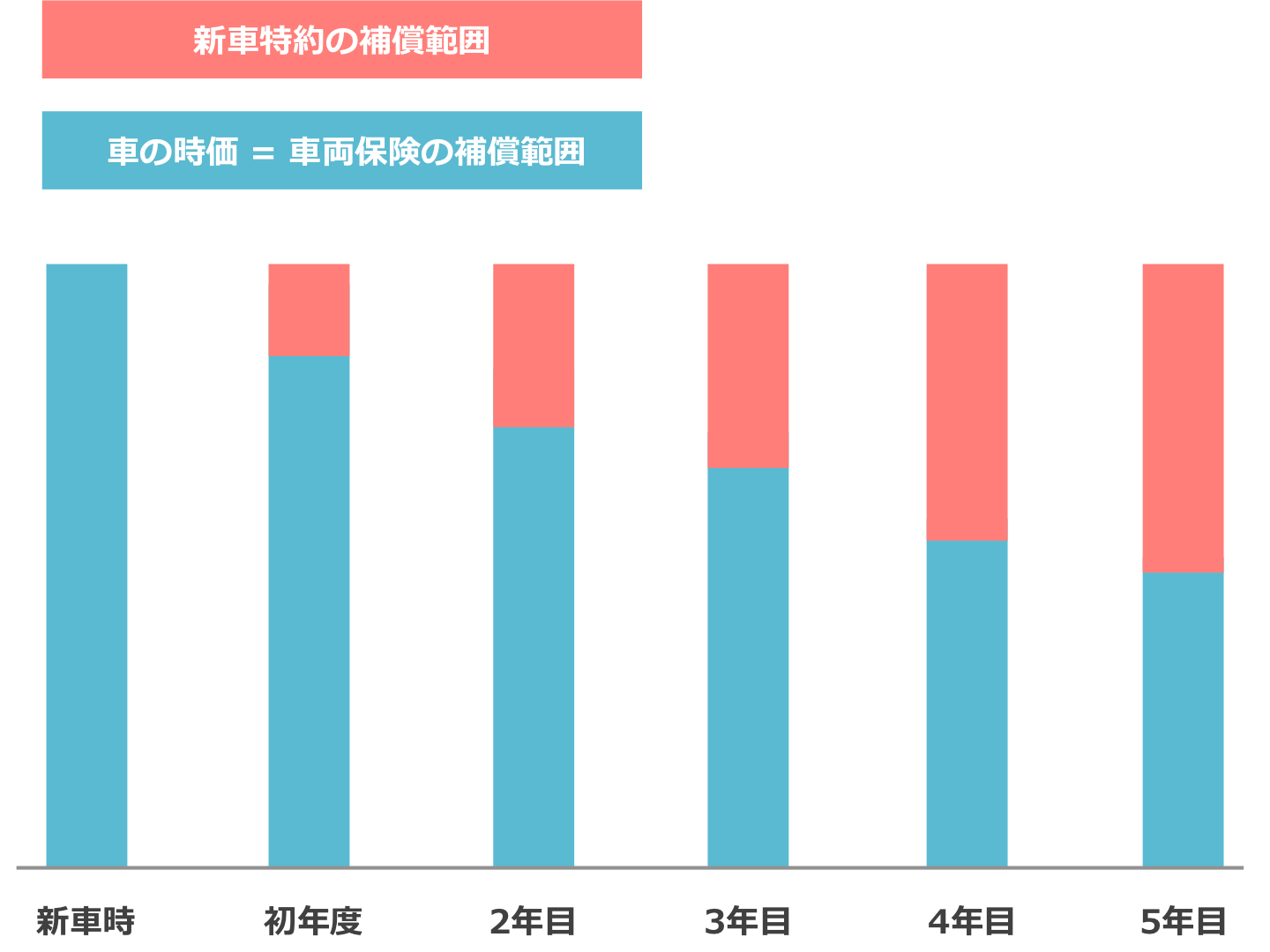 車は初年度以降、時価で見ると価値が下がって行くので、車両保険も時価までしか補償できませんが、新車特約は車の時価を超えて新車時の価値までが補償上限となります。