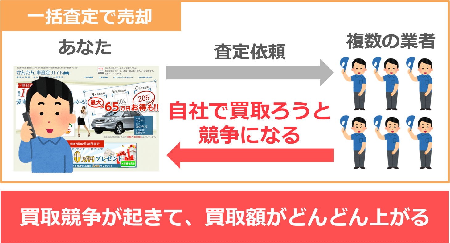 一括査定の場合は、複数の業者があなたの車を買取ろうとして競争が起きます。
